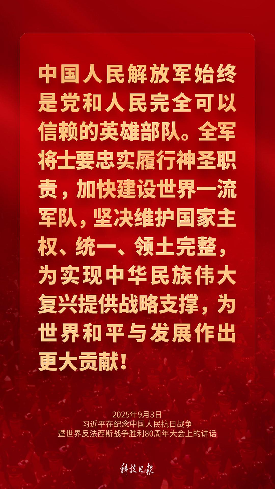 9月3日上午,纪念中国人民抗日战争暨世界反法西斯战争胜利80周年大会在北京天安门广场隆重举行。中共中央总书记、国家主席、中央军委主席习近平发表重要讲话强调——