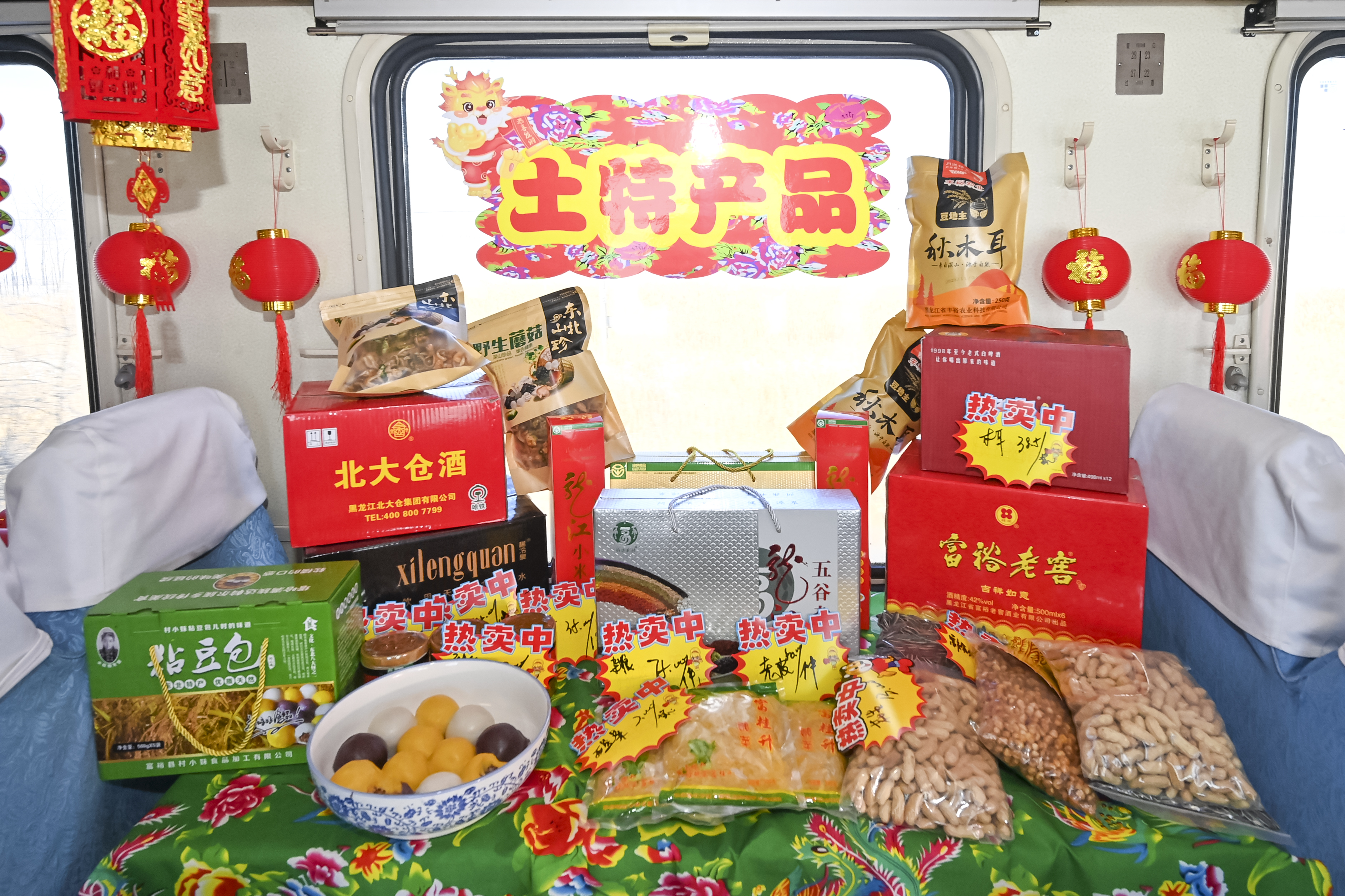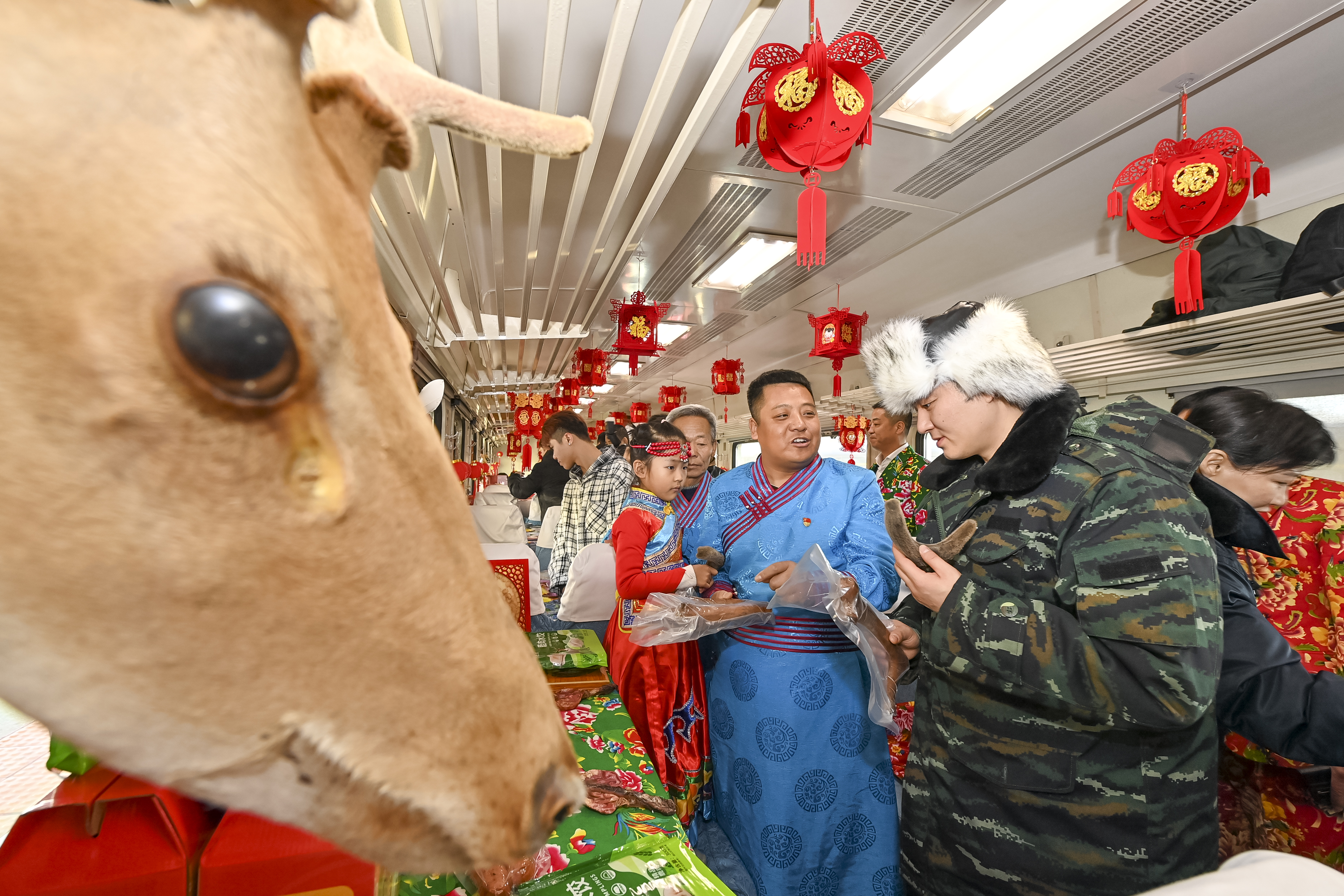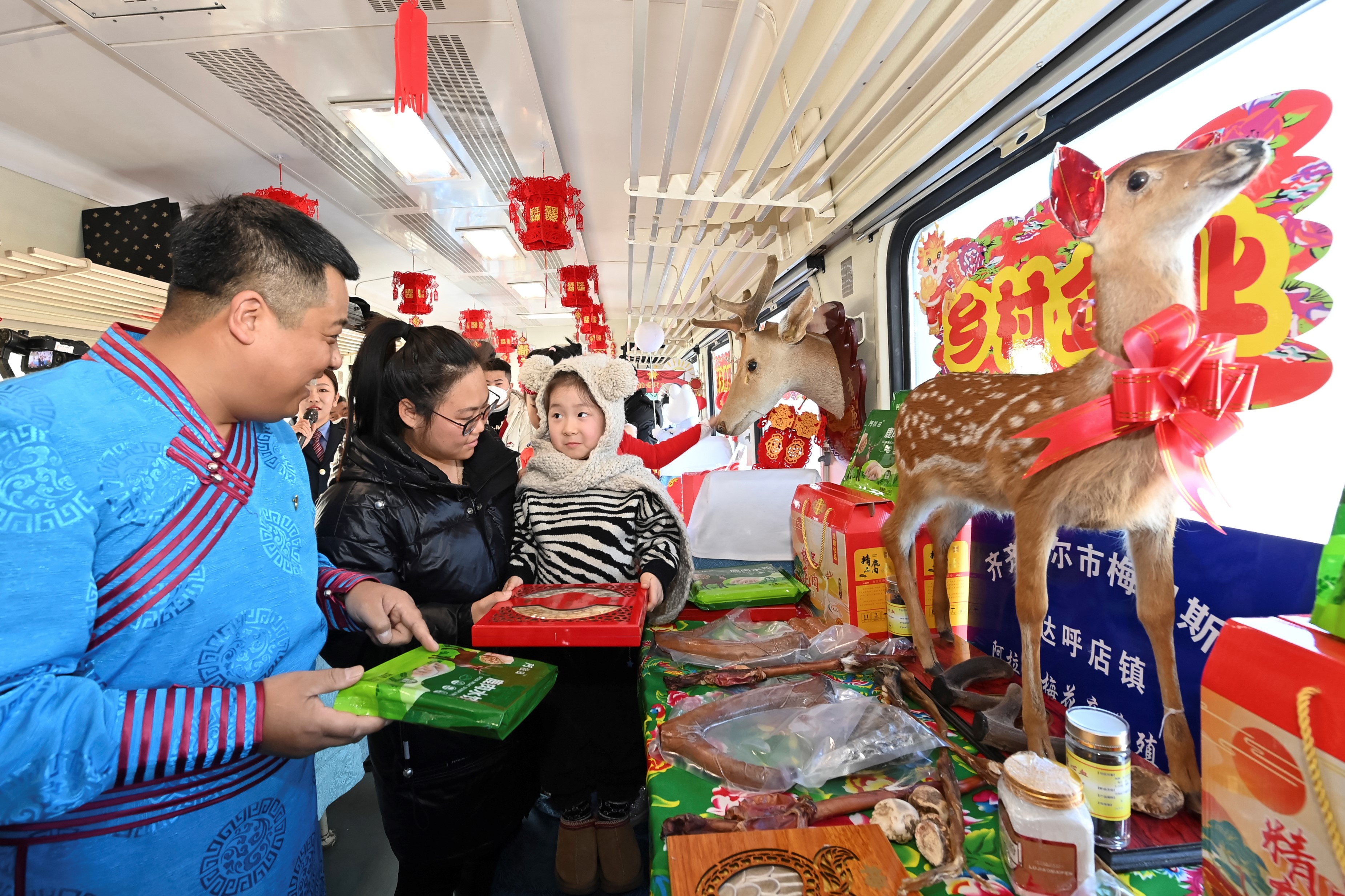 “欢迎来到列车大集挑选东北特色年货。”1月25日,在齐齐哈尔开往加格达奇的4045次列车上,车厢里张灯结彩,桌子上的货品琳琅满目,这是中国铁路哈尔滨局集团有限公司开办的列车年货大集。与以往不同的是,今年除生鲜果品外,还有非遗文化产品柴窑茶具、达斡尔族鹿茸,鹿肉饺子等特色商品,身着铁路制服的工作人员正在为旅客们介绍。