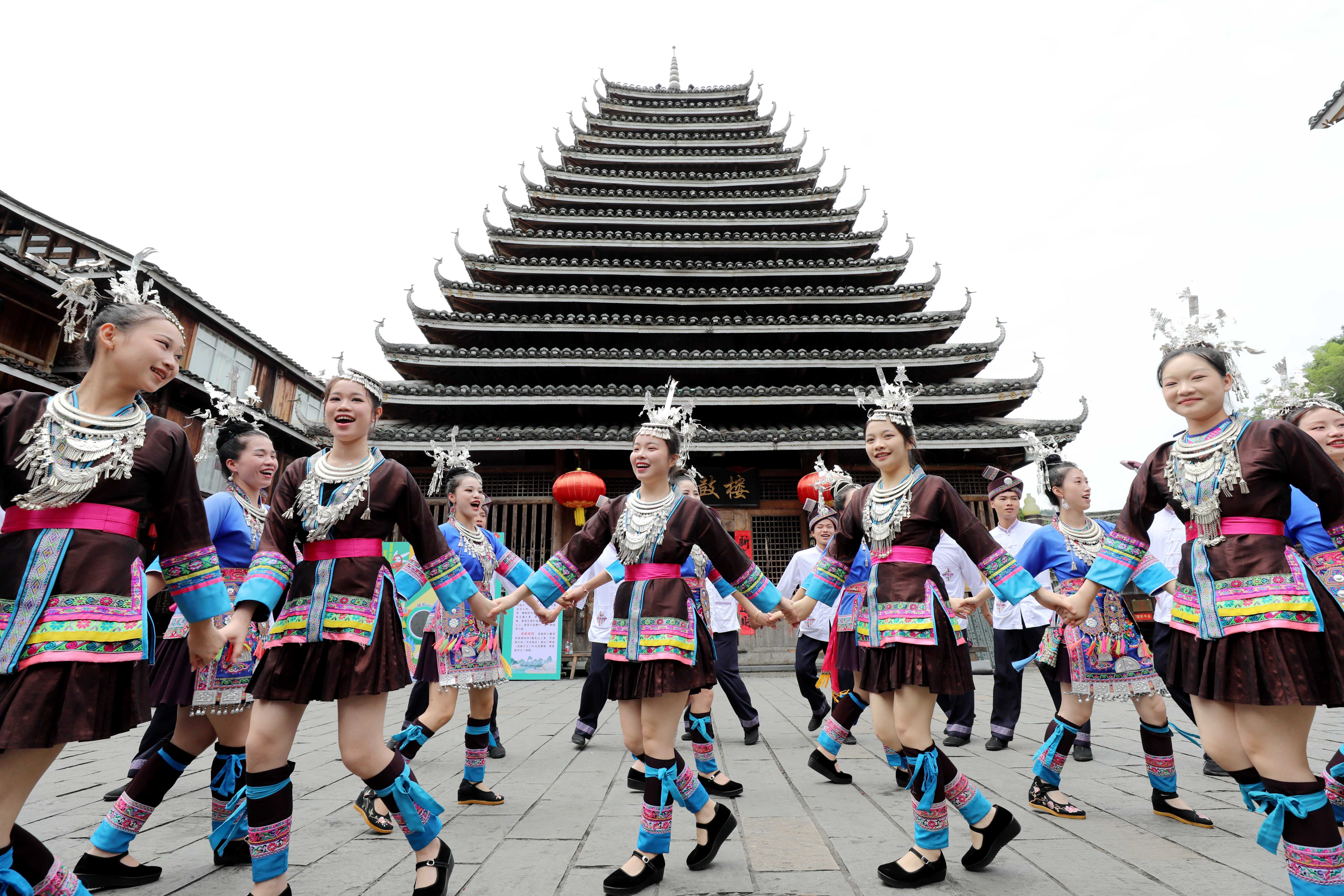 在三江侗族自治县林溪镇程阳八寨景区,人们在欢跳多耶。龚普康 摄