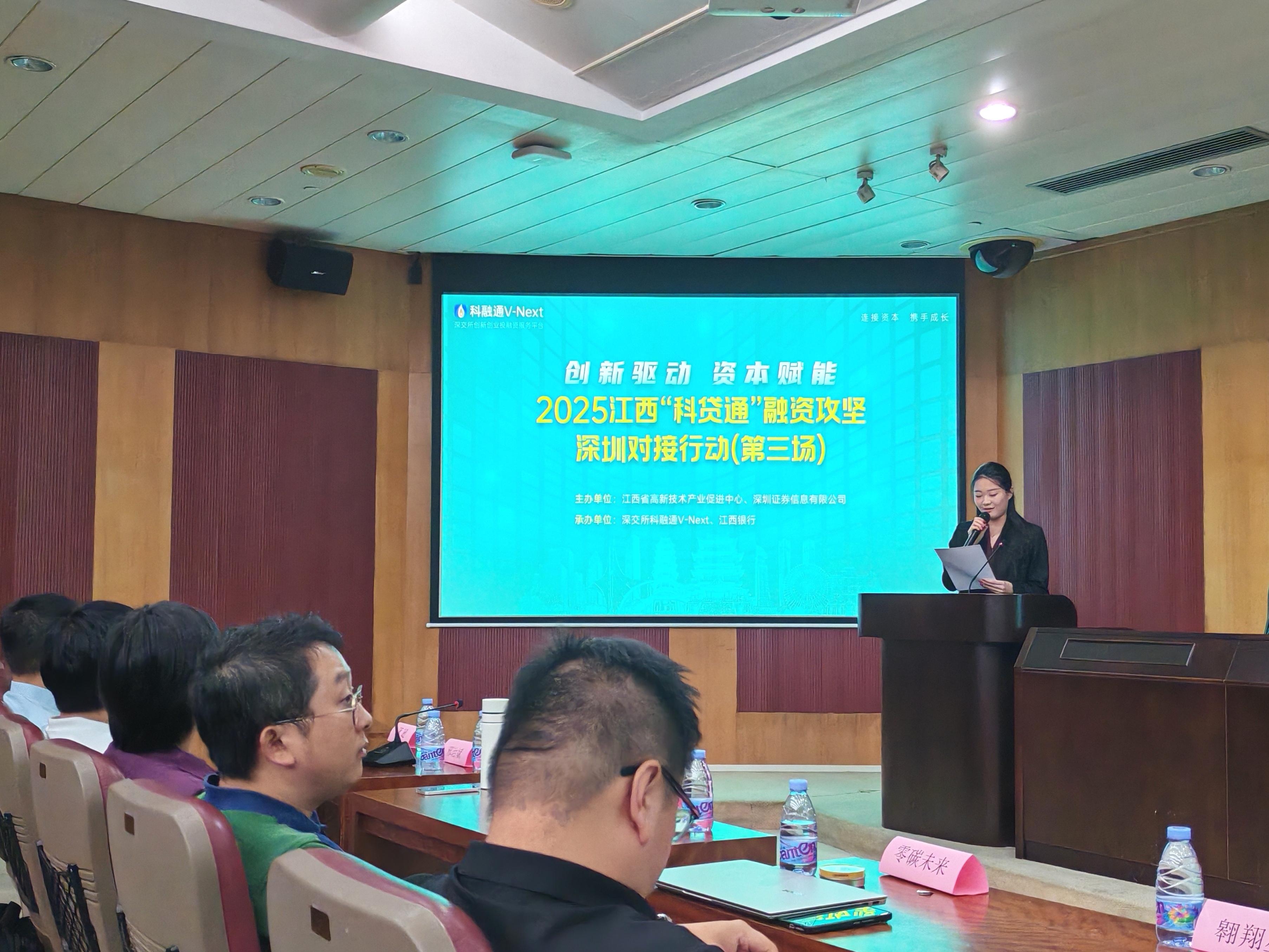9月10日,由江西省高新技术产业促进中心主办,深交所科融通V-Next、江西银行承办的江西省2025年“科贷通”融资攻坚投融资对接会(第三场)在深圳深业中心成功举办。本次对接活动旨在为企业搭建高效、全面的展示平台,同时帮助省内外投融资机构精准发掘对接优质项目,引导资本“投早、投小、投长期、投硬科技”。此次活动特邀红杉中国、深创投等国内一线投资机构的专家进行现场点评,通过项目路演、专家点评和自由洽谈等形式,助力科技企业加速成长。