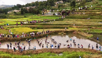 在云南省红河州,元阳哈尼小镇国庆假期举办了首届哈尼梯田泥泞挑战赛。“泥地寻宝”“梯田拔河”“稻田捕鱼”等项目趣味十足。300余名参赛选手们在梯田间奔跑,体验别样的农耕乐趣。