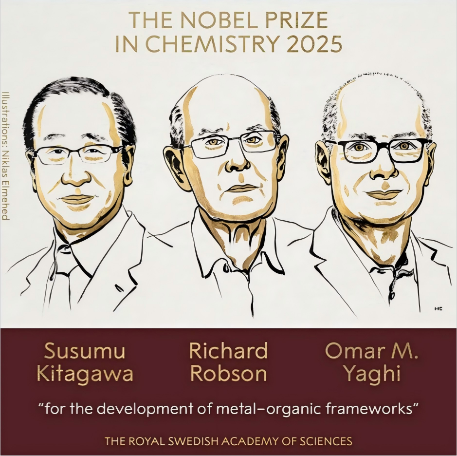 刚刚,瑞典皇家科学院宣布,将2025年诺贝尔化学奖授予北川进(Susumu Kitagawa)、理查德·罗布森(Richard Robson)和奥马尔·亚吉(Omar M. Yaghi),以表彰他们“在金属有机框架材料的开发”方面作出的贡献。