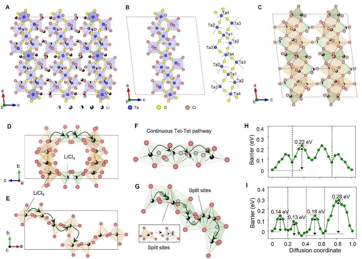 为了研发出理想的卤化物固态电解质材料,研究团队创新地提出混合阴离子结构设计策略,并通过共熔法,制备出高度结晶的含氧卤化物Li3Ta3O4Cl10。“锂离子从四面体到四面体传导是传输能垒最低的方式之一,但该现象一直以来只片面地存在于硫化物电解质中。”团队成员、加拿大西安大略大学博士后赵斐鹏说,“锂离子在该含氧卤化物中实现了从四面体到四面体三维连续传输路径,刷新了卤化物基固态电解质的室温离子电导率纪录,达到13.7毫西门子每厘米。”