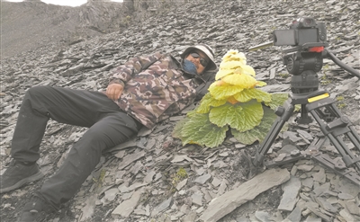 胡昆池戴着墨镜侧躺在这堆乱石上,神采飞扬。在他身旁的是一株正在肆意生长的黄色植物,名为塔黄。找到它,记录它,胡昆池团队花了几个月。