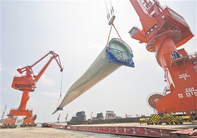 起重机将B1260A型超大型海上风电叶片从货轮吊运上岸。(视觉中国供图)