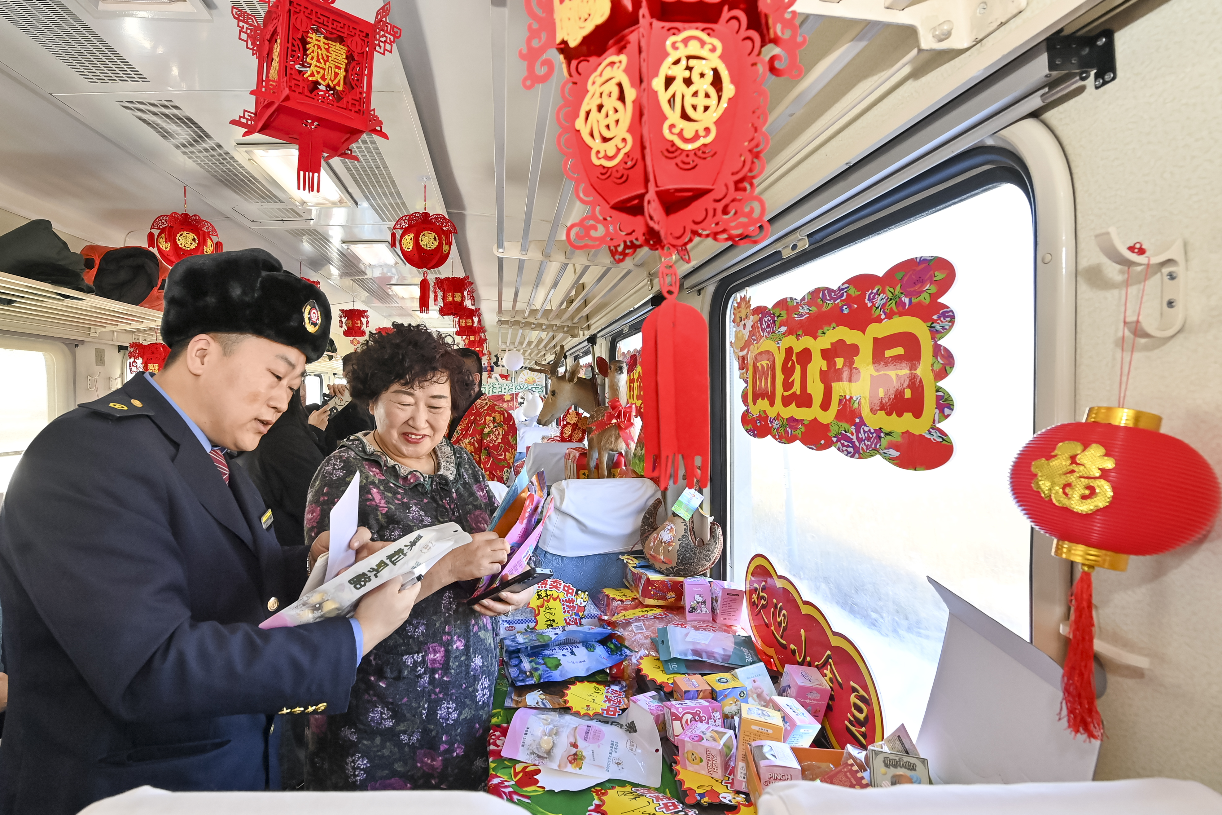 “欢迎来到列车大集挑选东北特色年货。”1月25日,在齐齐哈尔开往加格达奇的4045次列车上,车厢里张灯结彩,桌子上的货品琳琅满目,这是中国铁路哈尔滨局集团有限公司开办的列车年货大集。与以往不同的是,今年除生鲜果品外,还有非遗文化产品柴窑茶具、达斡尔族鹿茸,鹿肉饺子等特色商品,身着铁路制服的工作人员正在为旅客们介绍。